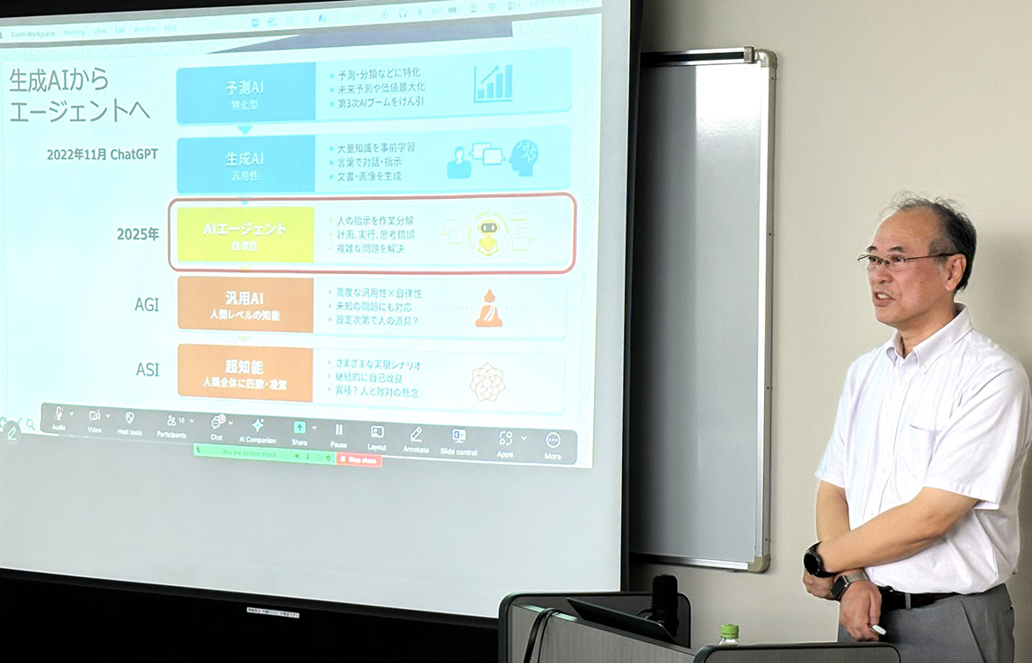 加藤 泰久 教授は、「生成AI時代の大学教育への挑戦 ~学習支援・学習設計の革新と成果評価の未来へ~」というテーマのもと、生成AI時代がもたらす大学教育の変容や本学における学習環境と学習者支援、未来へ向けた大学の新たな使命と展望について講演を行いました。
