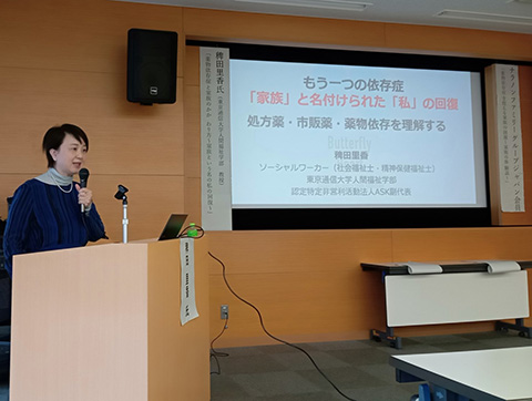 稗田 里香 教授は「薬物依存症と家族のかかわり方~家族という名の私の回復~」をテーマに、医療ソーシャルワーカーとしての豊富な経験をもとに、薬物依存症の基本的な知識に加え、回復や再発予防のための支援方法について、具体的な事例を交えながら講演を行いました。