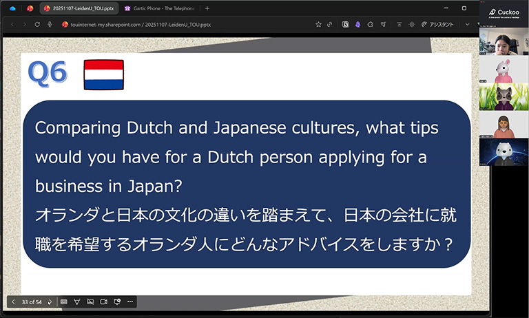2025年11月7日(金)、オランダのライデン大学と共同で、オンライン国際交流会『つながる文化、ひらく未来~ 日・オランダ友好425周年記念オンライン交流会 ~』を開催しました。